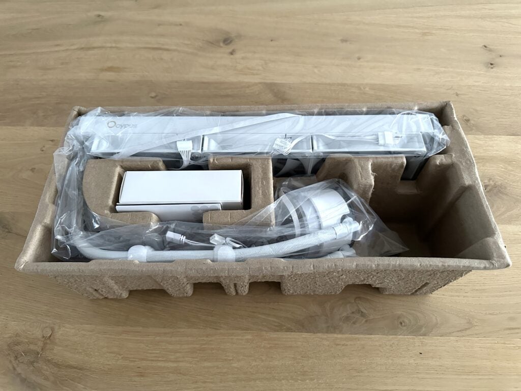 De Ocypus Delta L36 V2 maakt meteen een verzorgde en stevige indruk zodra je hem uit de doos haalt. Het geheel ziet er mooi afgewerkt uit en straalt kwaliteit uit — van de radiator tot de pomp en de aansluitingen.