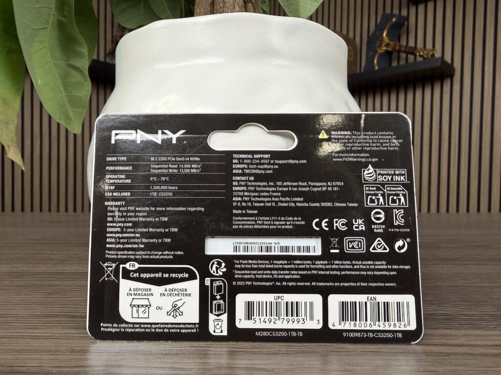 De CS3250 maakt gebruik van een nieuwere Phison PS5025-E28 controller. Deze zou opmerkelijk snel, koel en energie-efficiënt moeten zijn. De PNY CS3250 komt in drie modellen: 1TB, 2TB en 4TB. In deze review behandelen we de 1TB-variant, die een gemiddelde marktprijs heeft van rond de € 145,-.
