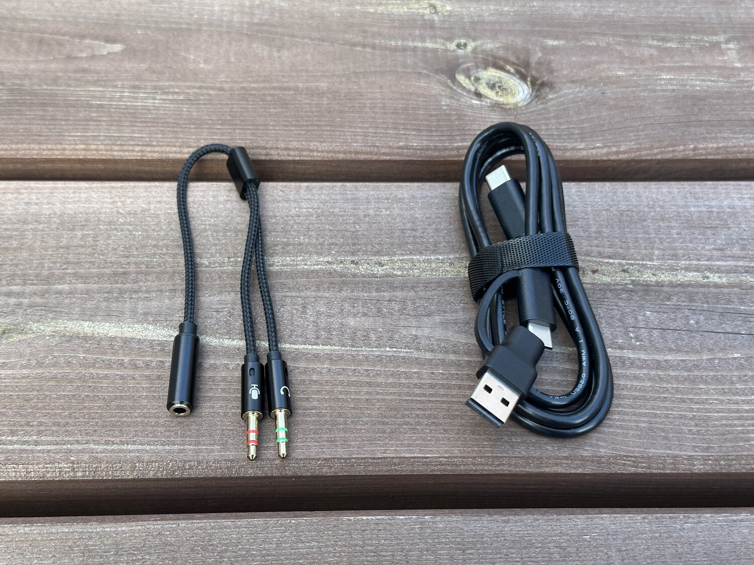 In de doos vinden we zelf twee kabels, namelijk een USB-C-naar-USB-C-kabel waarbij er een verloop meegeleverd wordt naar USB-A en een verloopkabel van 3,5 mm TRRS naar een losse 3,5 mm TRS en een aparte 3,5 mm-connector voor de microfoon. Die laatste kabel is vooral belangrijk als je een headset wil aansluiten en waarom dat is, komen we later op terug. De kabels zelf zijn van mooie kwaliteit en klikken ook lekker stevig vast, iets wat we altijd kunnen waarderen.