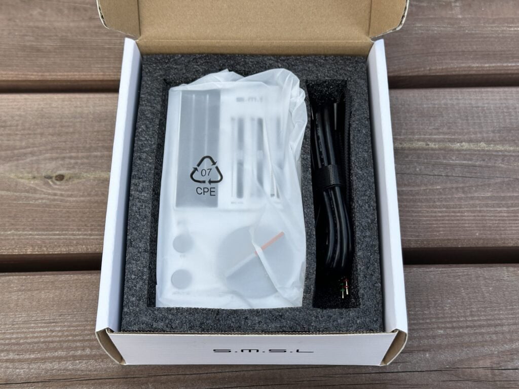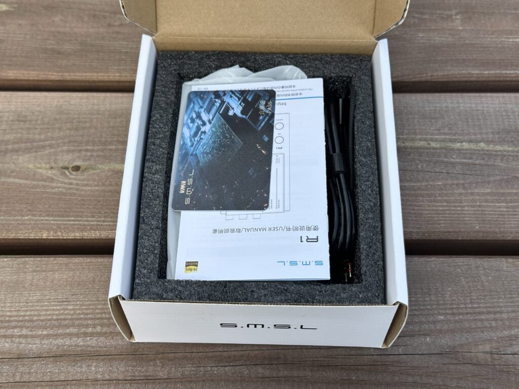 Bij het openmaken van de R1 zien we dat ook de binnenkant voldoende liefde heeft gekregen, waarbij de R1 zelf naast de kabels netjes in speciaal gevormd schuim op zijn plaats gehouden wordt. Dit schuim biedt tevens betere schokbescherming dan een simpele kartonnen binnenverpakking en de kabels worden ook met een strakke klittenbandstrip bij elkaar gehouden. Uiteraard vinden we in de doos ook een korte handleiding en een soort bankpasje, waarbij je het gevoel krijgt direct bij de S.M.S.L.-club te horen. Kortom, van de uitpakervaring worden we behoorlijk vrolijk.