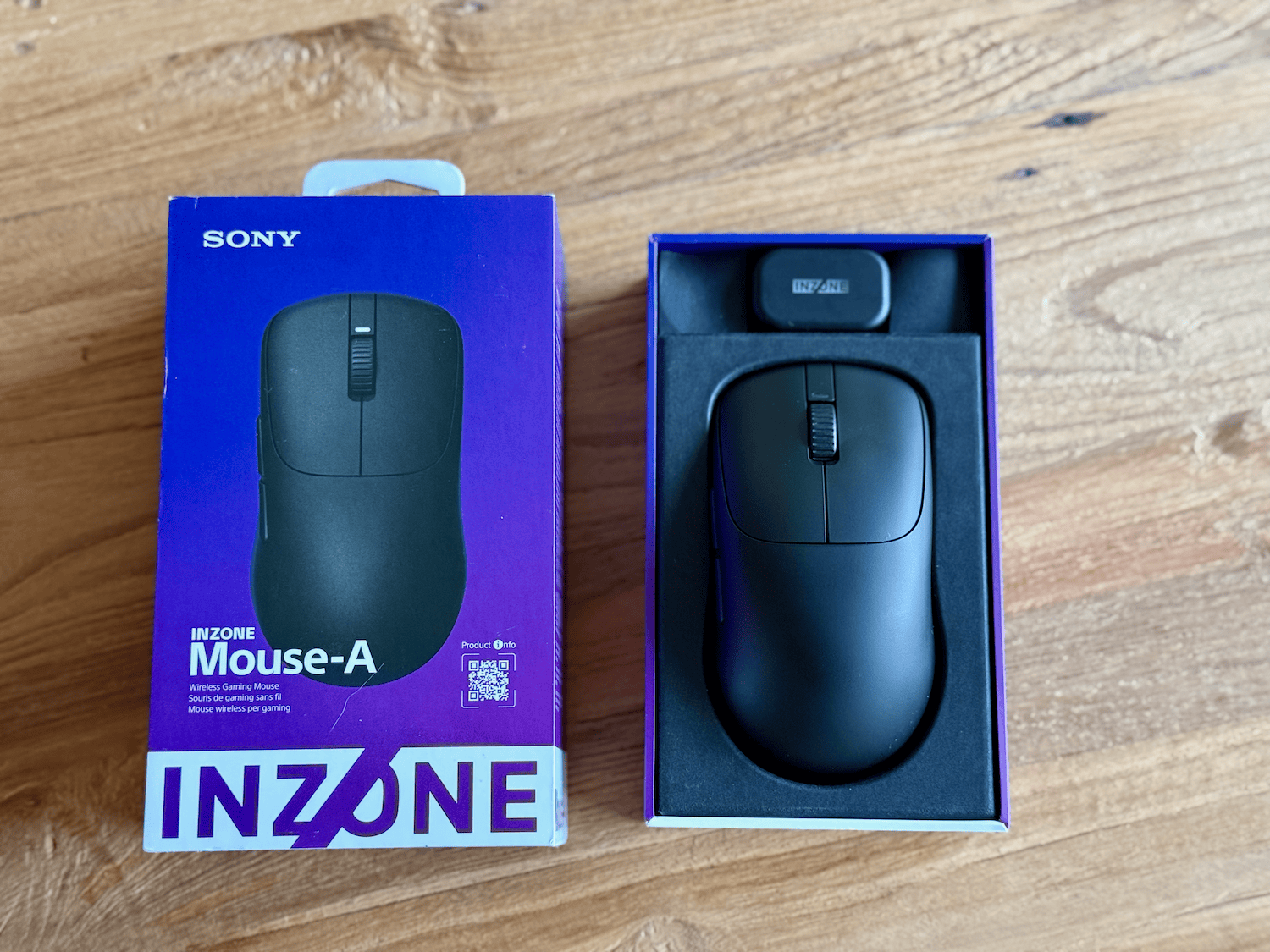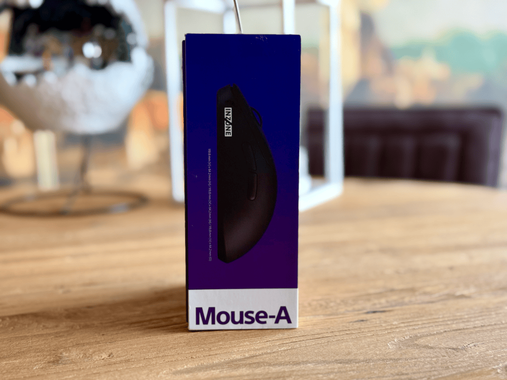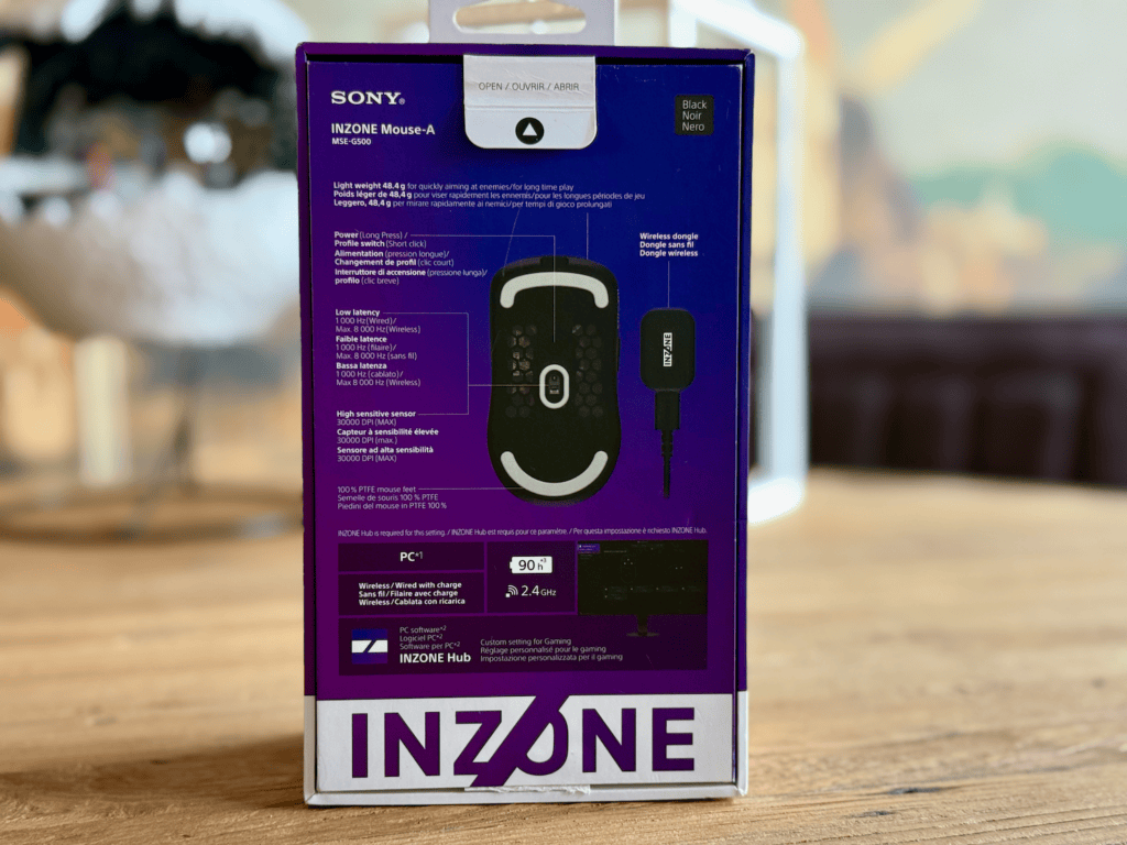 De productverpakking is prachtig vormgegeven met de paarsblauwe gradient. Uiteraard onmiskenbaar wat erin zit, de Mouse-A van SONY INZONE. Op de voorkant zien we een mooie voorvertoning, en op de achterkant wat meer productspecificaties. De zijkant is voorzien van de naam van het artikel en de muis zit netjes met de 2.4 GHz-dongle in de doos.