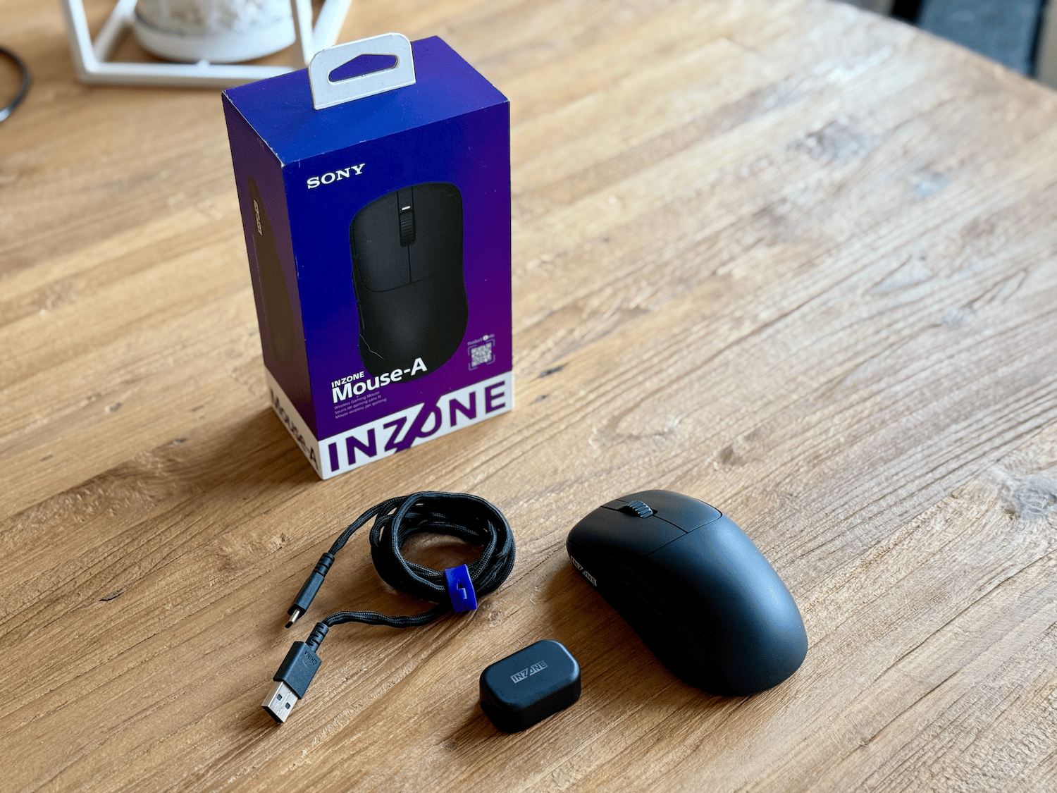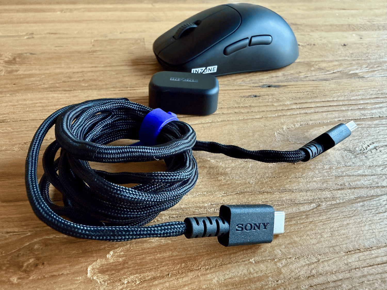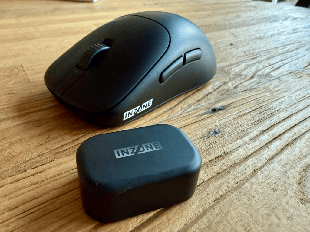 We zien dat we naast de muis en de dongle ook nog een gevlochten USB-A-naar-USB-C-kabel ontvangen om de dongle mee aan te kunnen sluiten op de pc. De muis is mooi vormgegeven, met het INZONE-logo op de zijkant bedrukt. Je ziet ook dat de structuur van de muis vrij glad is en enigszins vingerafdrukgevoelig.