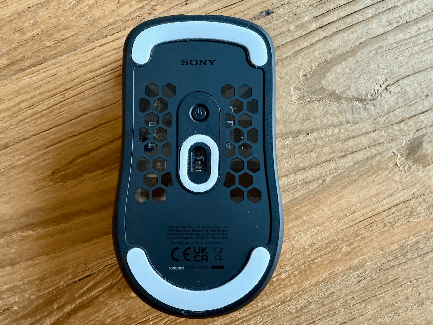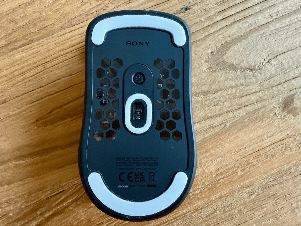 De onderkant van de muis laat de honingraatstructuur zien, en een klein stukje doorzichtig plastic wat de elektronica een beetje laat zien. Hier zie je normaal niet veel van, maar het is een leuk detail. De 2,4 GHz-dongle is ook voorzien van het INZONE-logo en is iets groter dan die van andere merken.