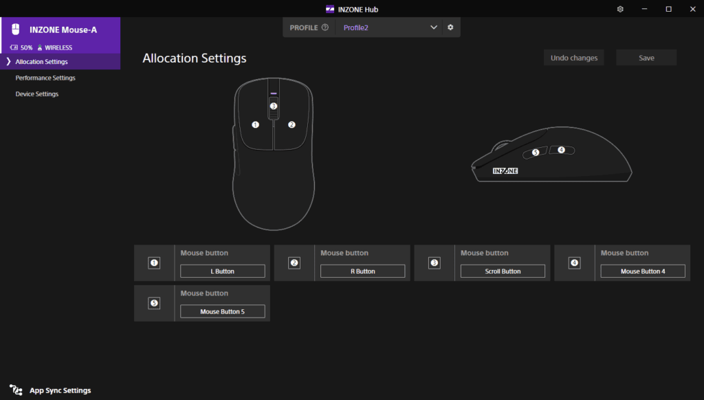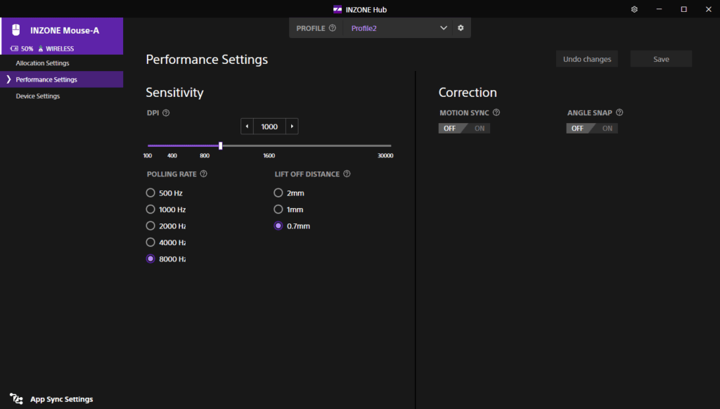 SONY heeft voor de INZONE-gaminghardware de applicatie “INZONE Hub" beschikbaar op zijn website. Dit is een applicatie zonder al te veel poespas, die goed en duidelijk werkt. De software is erg overzichtelijk en zoals we in bijgaande screenshots kunnen zien, kan je op de ‘performance settings’-tab de meest gangbare instellingen van de muis aanpassen. De meest prominente zijn natuurlijk de polling rate die is aan te passen van 500 tot 8000 Hz, en de LOD (Lift off distance). Deze heb ik aangepast naar 0,7mm, omdat ik nogal eens de muis oppak en dit werkt bijzonder responsief.