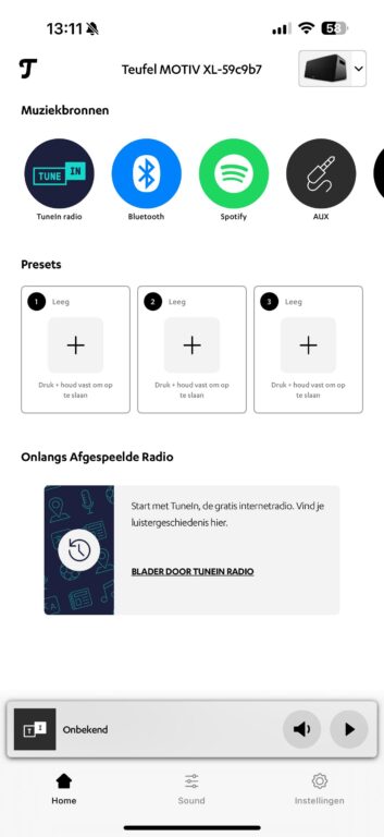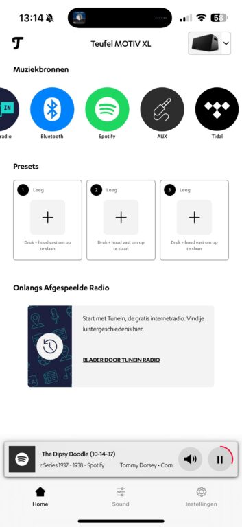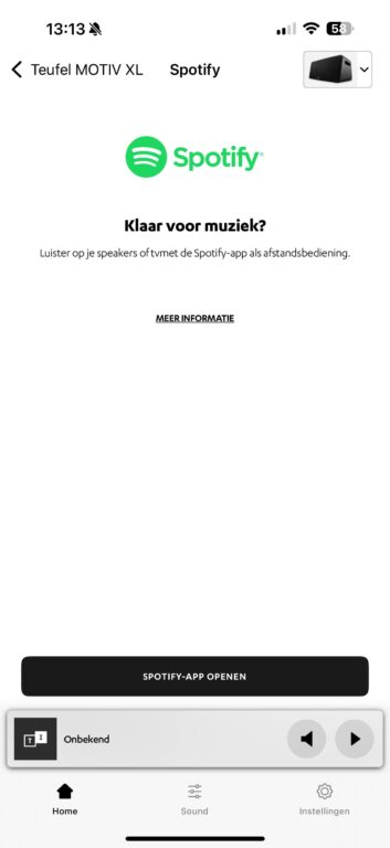 Met de Teufel Home-app hebben we de fysieke knoppen op de Motiv XL nauwelijks gebruikt. Het beheren van mediabronnen, zoals Spotify (dat we veelvuldig gebruikten), verloopt moeiteloos via de app. Bovendien werkt directe bediening vanuit Spotify zelf eveneens probleemloos.