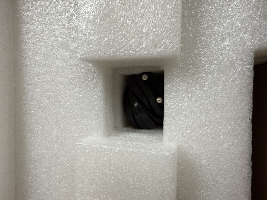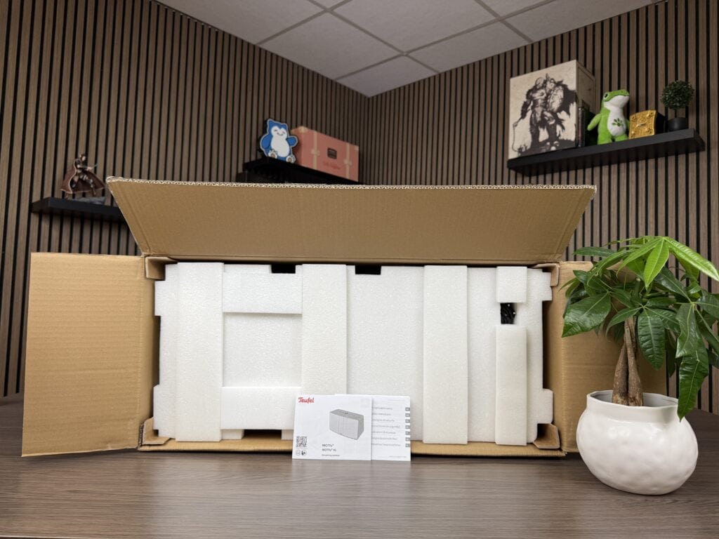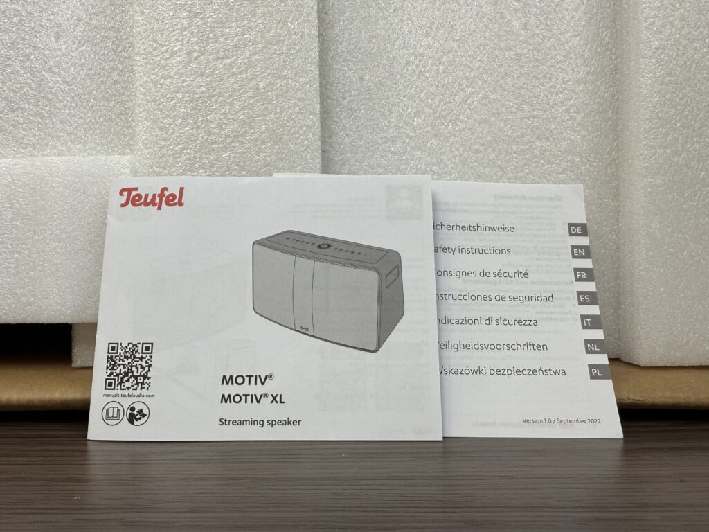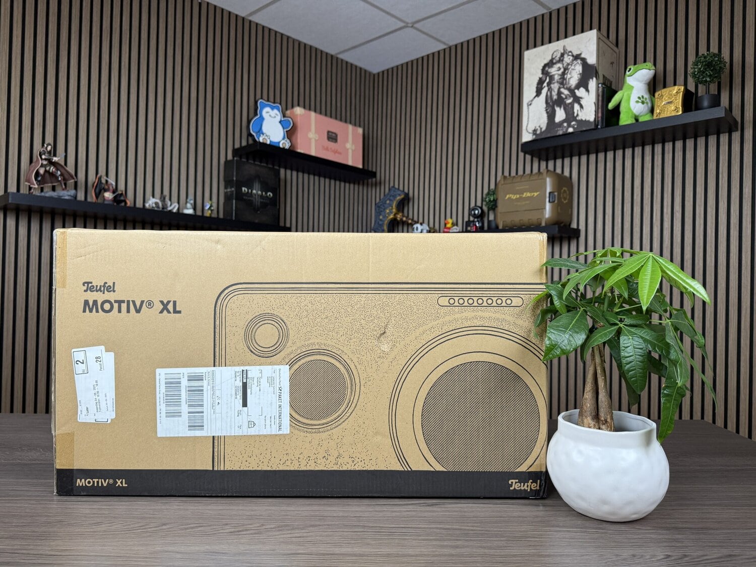 Dat de Motiv XL zijn naam eer aandoet, blijkt meteen bij het uitpakken. De verpakking is groot, maar de speaker is goed beschermd met stevig verpakkingsschuim. In de doos vind je de forse speaker van 12,9 kilo — vooral indrukwekkend in de breedte — samen met een handleiding en een voedingskabel.