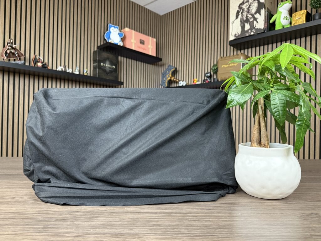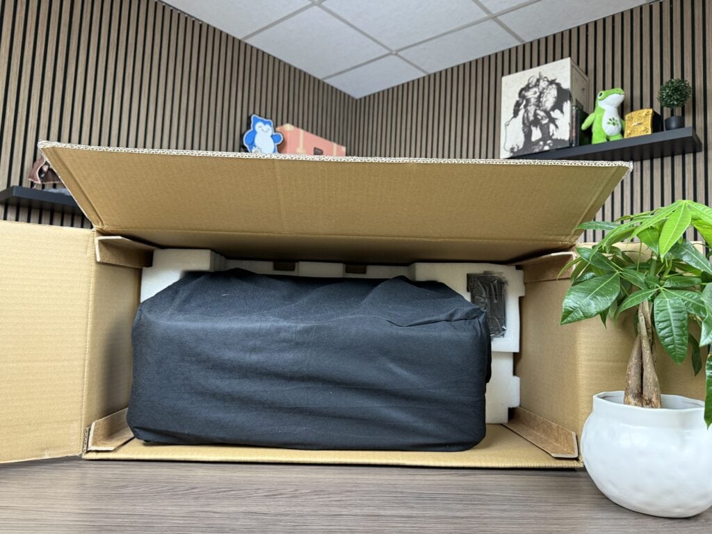De speaker is netjes beschermd met een zachte, gestoffeerde hoes. De eerste indruk? Een indrukwekkend bakbeest van een speaker. Qua ontwerp oogt hij redelijk traditioneel, met wat rondere vormen. Naar onze mening is het design niet bijzonder opvallend — hier draait het duidelijk meer om de techniek dan om de looks.