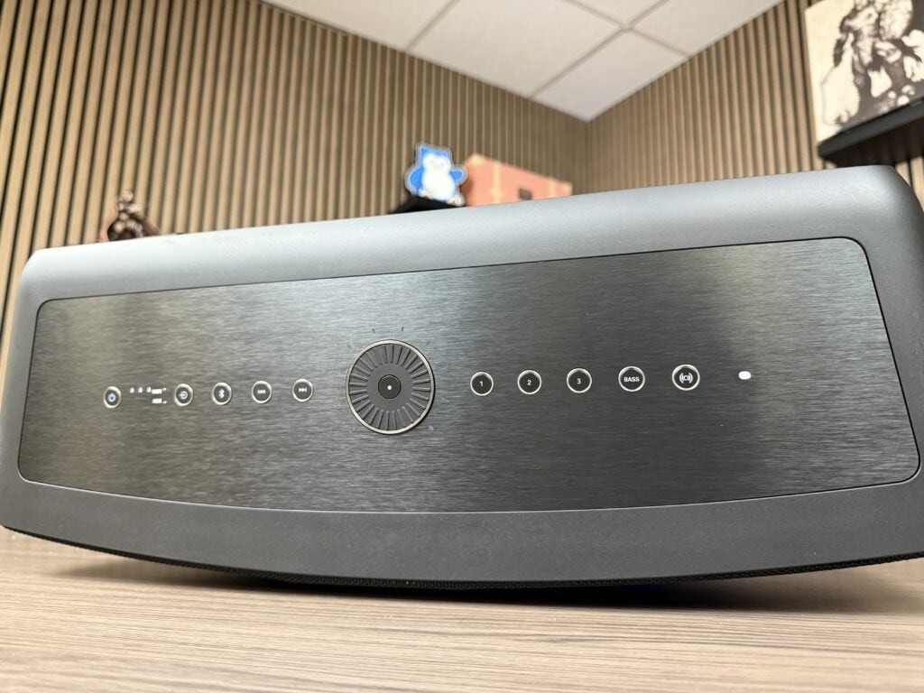 Bovenop de speaker bevinden zich de bedieningselementen. Hier vind je de aan/uitknop, een inputknop, een bluetoothknop, mediatoetsen met een volumewiel, drie programmeerbare functieknoppen, een knop voor de bas-boost en een Dynamore-knop.