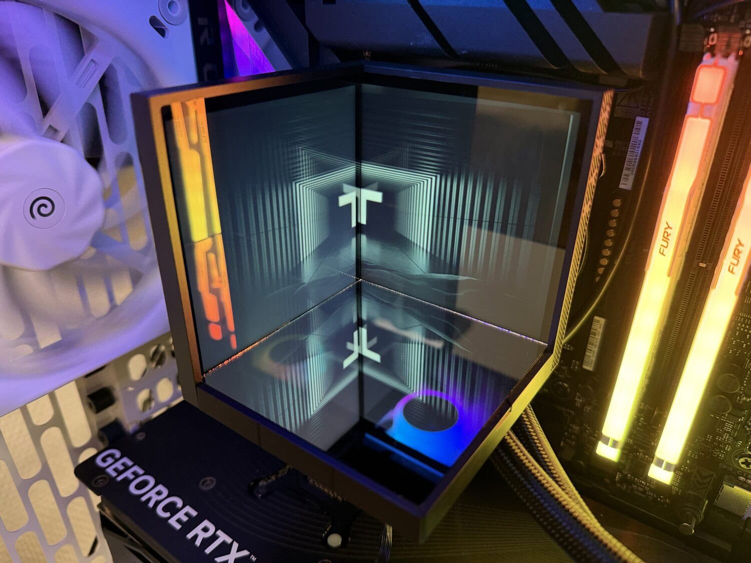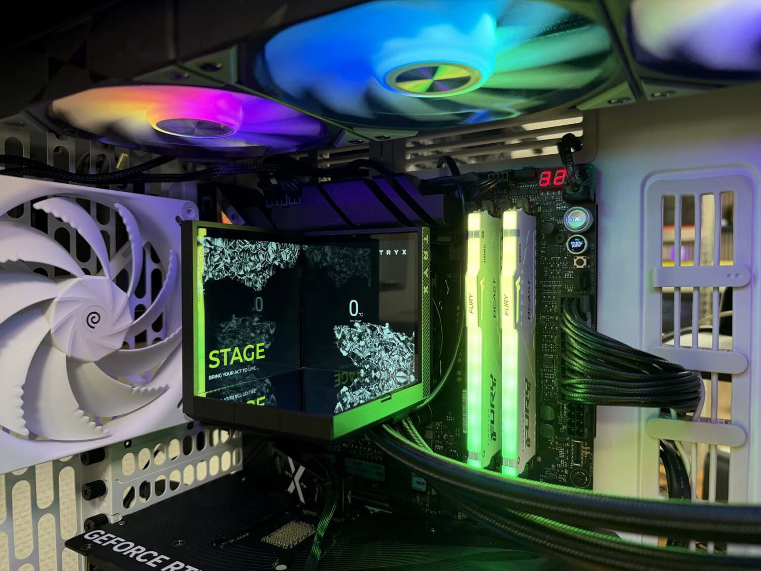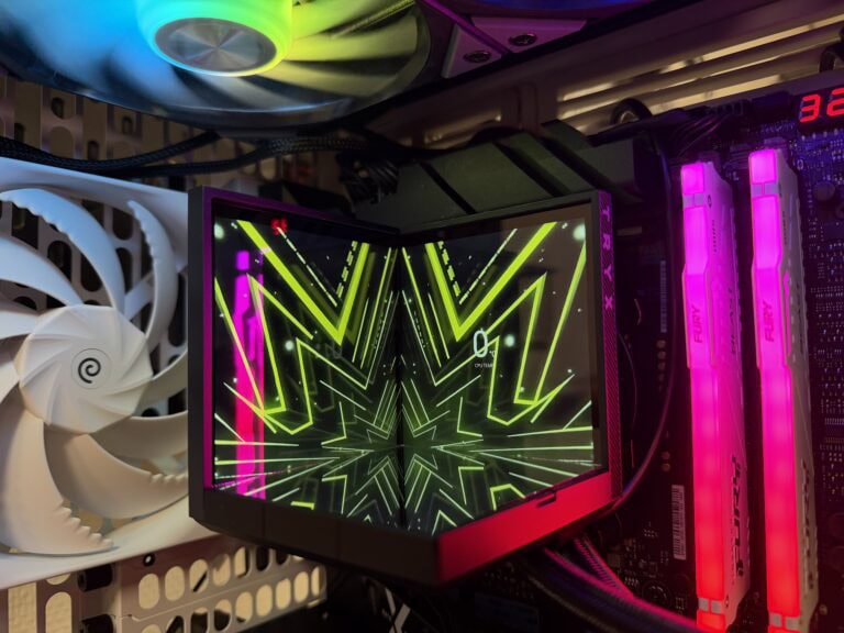 Laten we vooropstellen dat TRYX interessante keuzes maakt als het om waterkoelers gaat. De Stage 360 presenteert zichzelf goed op eigen podium. De visuele effecten op de twee 4-inch IPS-schermen ogen kleurvol en dynamisch. Het is best een bijzondere waterkoeler om te zien. De mogelijkheden, afhankelijk van je eigen creativiteit, zijn redelijk eindeloos. Wel heb je te maken met wat reflectie in de schermen, waardoor fans en RGB-geheugenmodules soms wat belemmeren aan het visuele aspect.