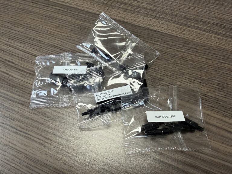 In deze review monteren we de Stage 360 op de ASUS ROG Crosshair X870E Dark Hero, een AM5-moederbord. De standaard kunststof-brackets maken ruimte voor zwarte afstandsbusjes met metalen standoffs om het waterblok te fixeren. De zwarte afstandsbusjes zijn voor zowel een AM5- als AM4-montage te gebruiken. Voor AM5 plaats je de zwarte afstandsbusjes met de groeven naar boven, waar dit bij AM4 gespiegeld is, dus naar beneden.