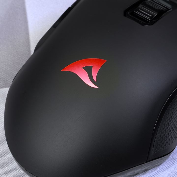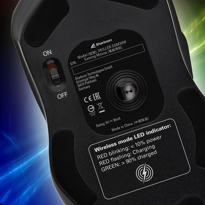Het RGB-verlichte logo op de bovenkant van de SKILLER SGM30W zorgt niet alleen voor kleurrijke highlights, maar dient ook als indicator voor de batterijstatus.