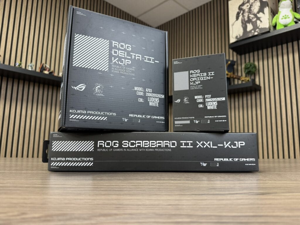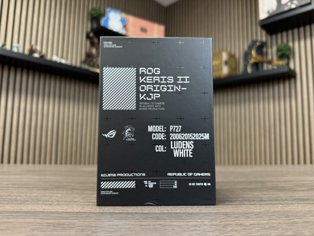Het avontuur vervolgen we met de ROG Keris II Origin KOJIMA PRODUCTIONS-editie. En de muis komt weer in dezelfde mooi vormgegeven verpakking als de headset, zwart met witte accenten.