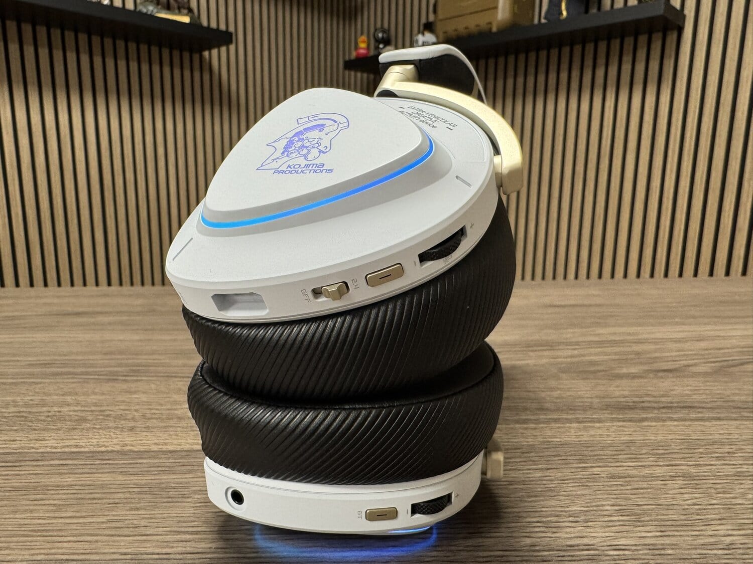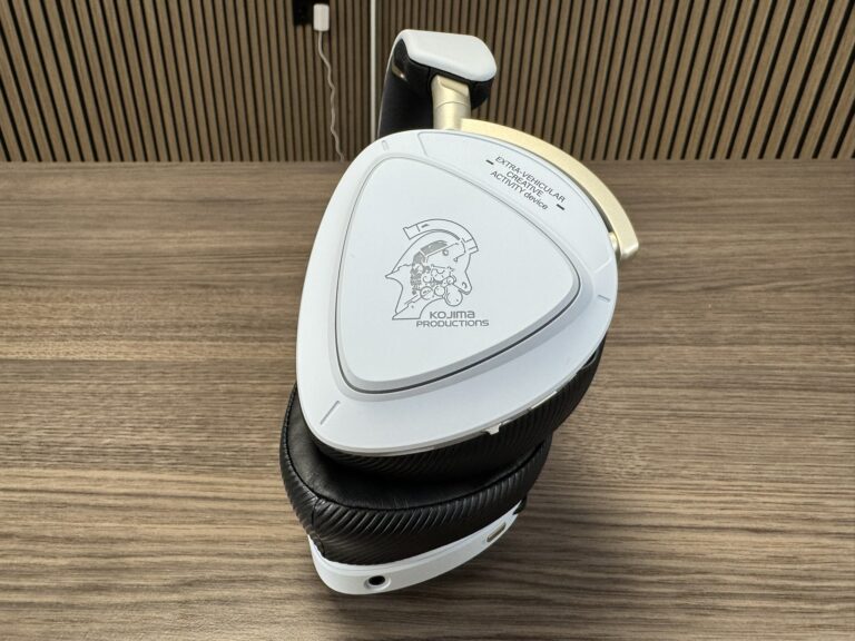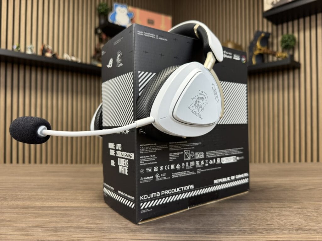 De headset is vormgegeven in een mooi en strak wit uiterlijk, met op de rechter oorschelp het bekende ROG-logo. Keren we de headset echter om, dan zien we het KOJIMA PRODUCTIONS-logo afgebeeld. Als ik ROG een beetje ken zit hier RGB-verlichting in.