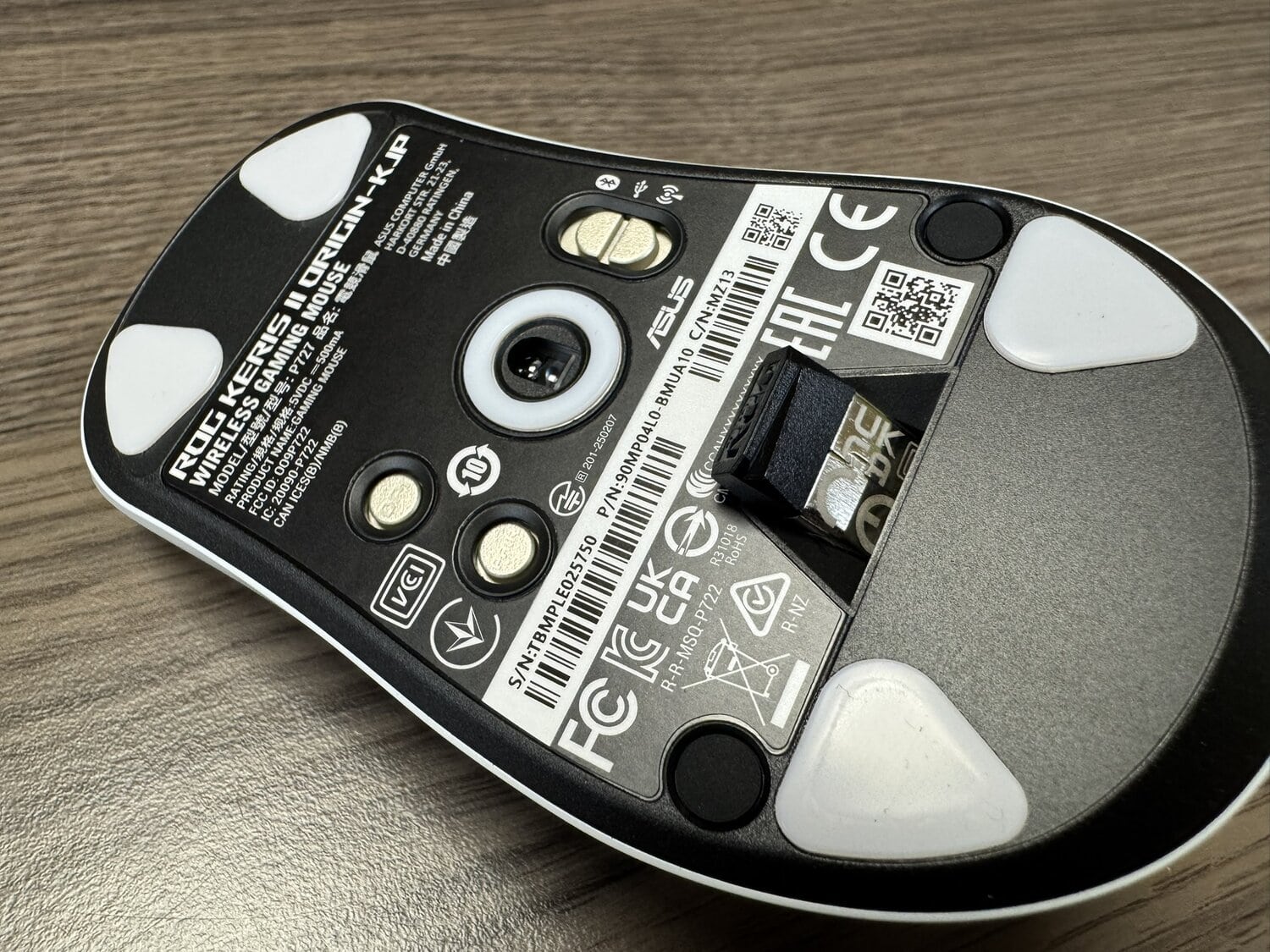 Het komt niet geheel als een verrassing dat ROG de 2,4 GHz-dongel heeft verstopt onder in de muis. Dit heb ik recent geleerd van mijn collega Pim, in mijn vorige review van ASUS: de Raikiri II-controller.