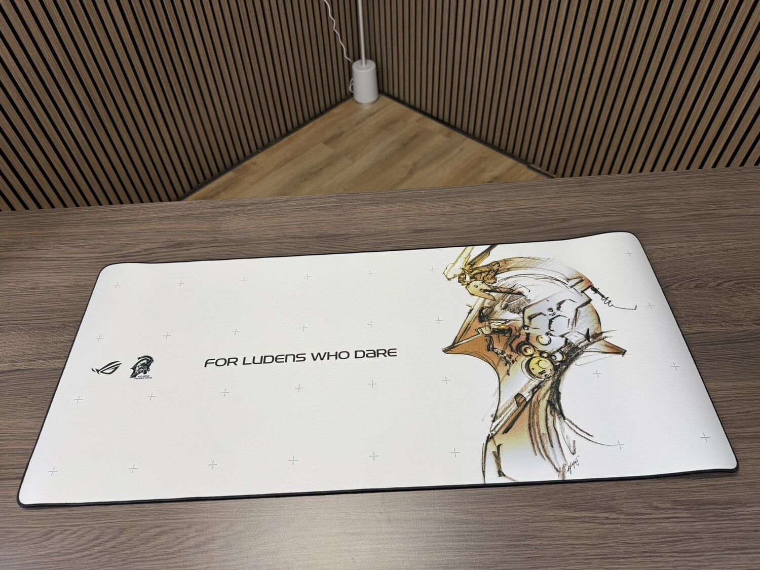 Wederom is het design in lijn met de Delta II en de Keris II Origins. Het futuristische patroon is weer sterk aanwezig, en de witte basis met matgouden accenten sluit heerlijk aan bij de rest van de ROG-set. Het geeft je setup een complete en luxe uitstraling zonder dat het te opzichtig wordt.