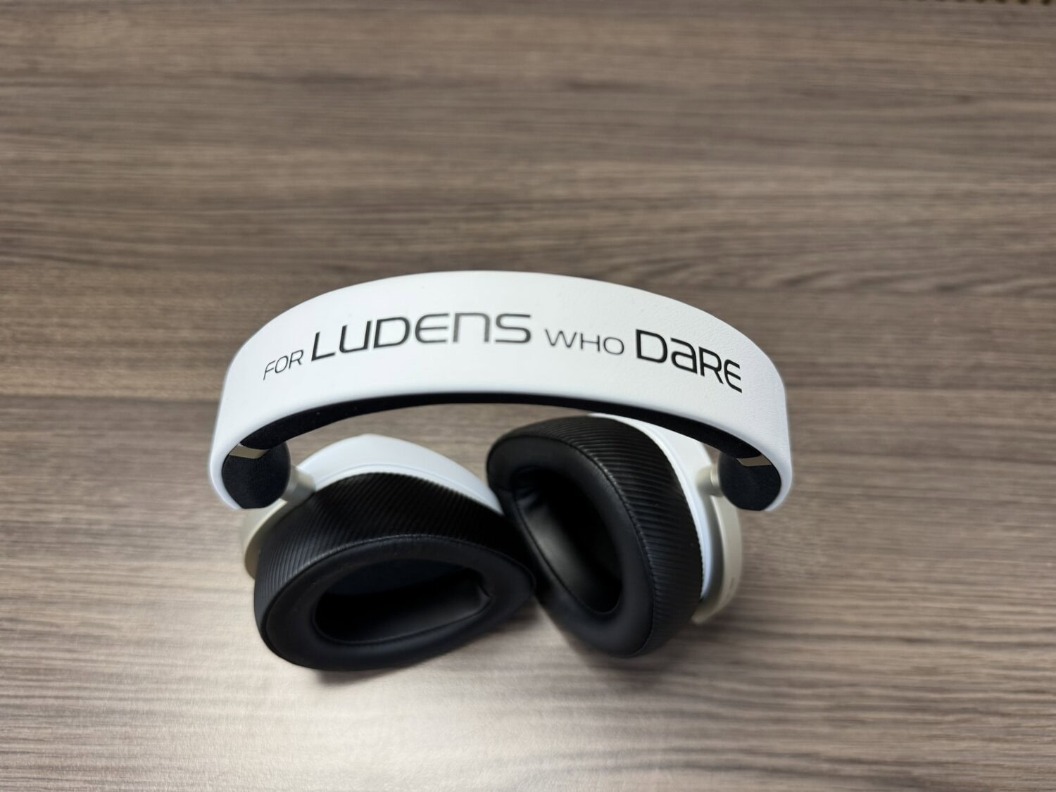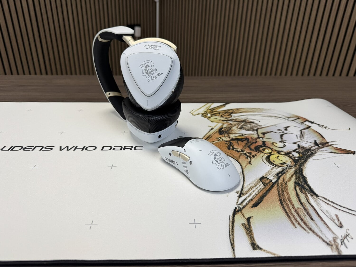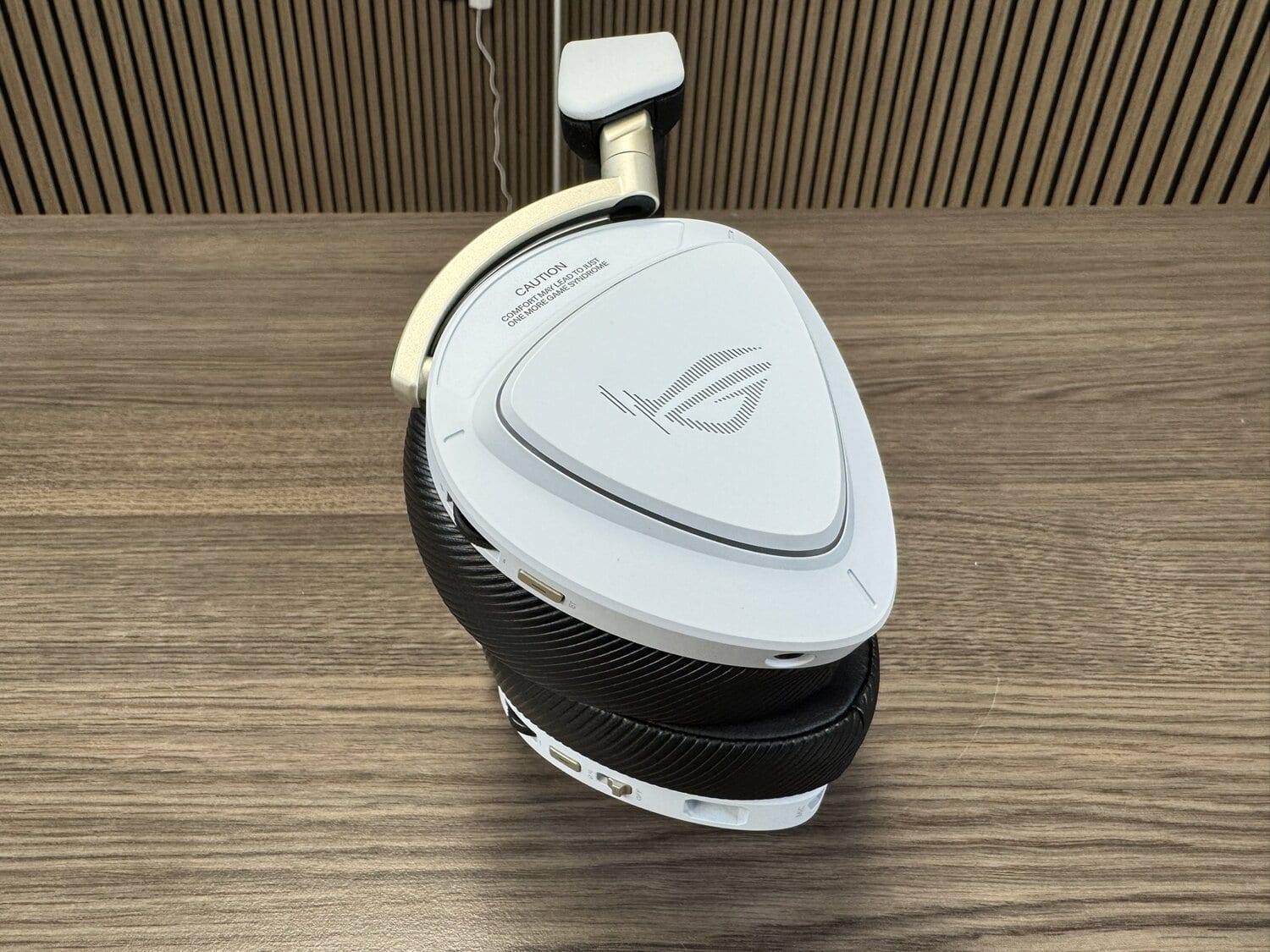 De oorschelpen zitten vast in een frame van subtiel matgoud, met rechts de productbenaming en links vinden we een waarschuwing weergegeven om de drivers niet te openen. Als we naar de hoofdband kijken die tevens super comfortabel aanvoelt, zien we een slogan die een mooie stempel zet op de samenwerking van ROG en KOJIMA PRODUCTIONS.
