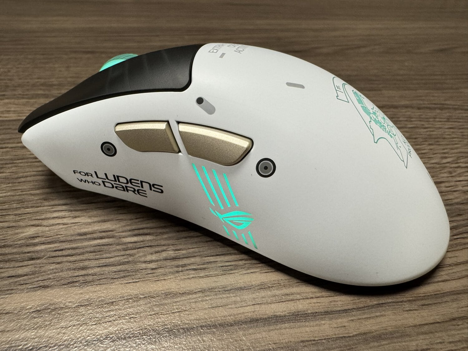 Maar als we dan naar de linkerzijde van de muis gaan kijken, dan vinden we twee duimknoppen, vormgegeven in hetzelfde matgoud als de knoppen op de headset. Tof om te zien dat alles zo samenkomt tot één mooie set. Onder de duimknoppen zien we het ROG-logo, waarvan ik wel verwacht dat hier ook RGB-verlichting in zal zitten, met helemaal aan de voorkant wederom een samenwerking slogan tussen ROG en KOJIMA PRODUCTIONS.