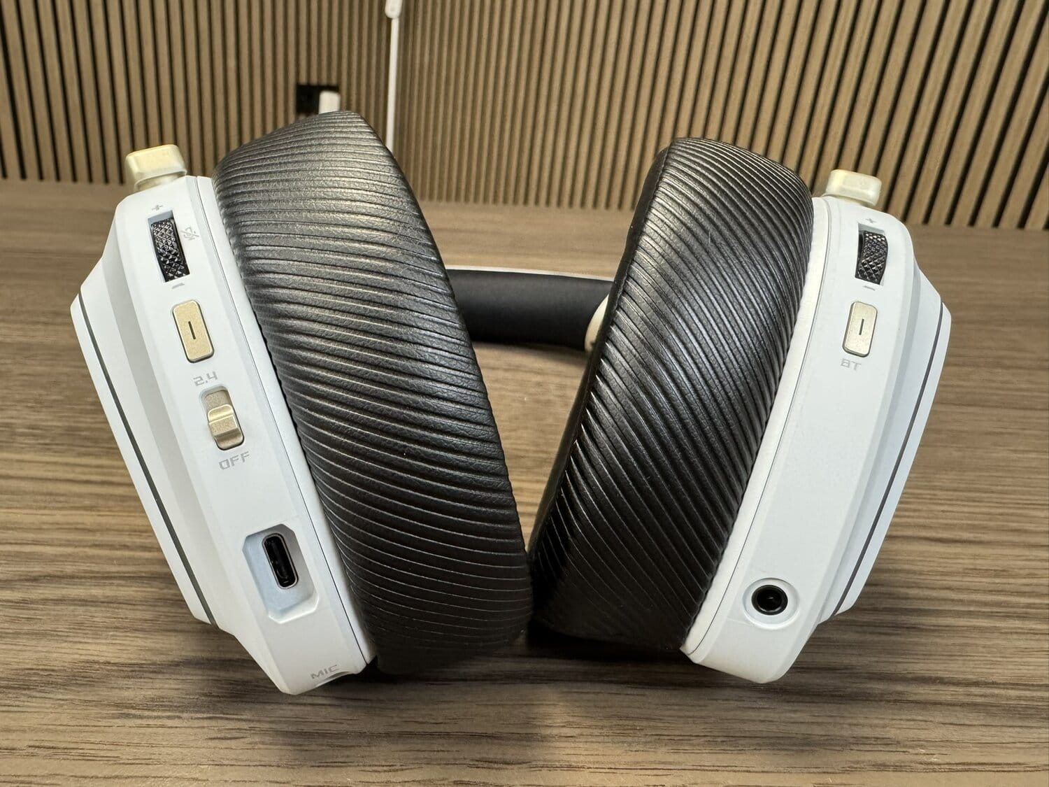 Gaan we kijken naar de linker oorschelp, dan vinden we uiteraard wat meer knopjes toegevoegd. Wederom vinden we een zwart draaiwieltje om het volume van de microfoon aan te passen, daaronder een gouden knop voor het verbinden via de meegeleverde 2,4 GHz, met daaronder een schuifknopje om de headset aan en uit te kunnen zetten, vormgegeven in hetzelfde matte gouden thema als de andere knopjes.