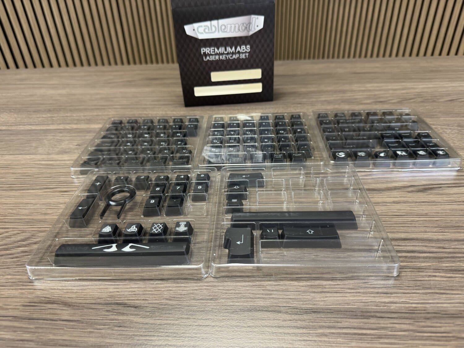 Als laatste bespreken we hier nog de Berserker Keycap Set die we hebben ontvangen van CableMod. Deze keycapset bestaat uit maar liefst 121 keycaps in de standaard ISO-indeling. Voor een aantal toetsen zijn twee opties meegeleverd voor de ultieme custom-ervaring. De keycaps zijn uitgevoerd in ABS met een UV-coating die helpt om de keycaps beter bestand te maken tegen de oliën uit je huid zonder de kenmerkende textuur op te geven. De keycaps zijn uitgevoerd met MX-stem support en passen dus op nagenoeg ieder toetsenbord.