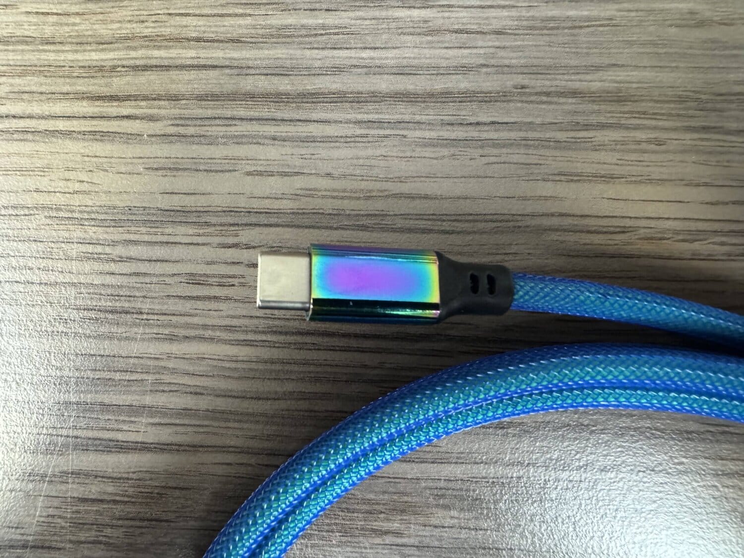 De kabel die wij samengesteld hebben is twee meter lang en heeft twee USB-C-connectors. De connectors zijn uitgevoerd in Anodized Rainbow en de sleeving is een dubbele sleeving met een groene binnenkabel en een blauwe buitensleeve. De connectors zijn tijdens het verzenden beschermd met een plastic endcap.