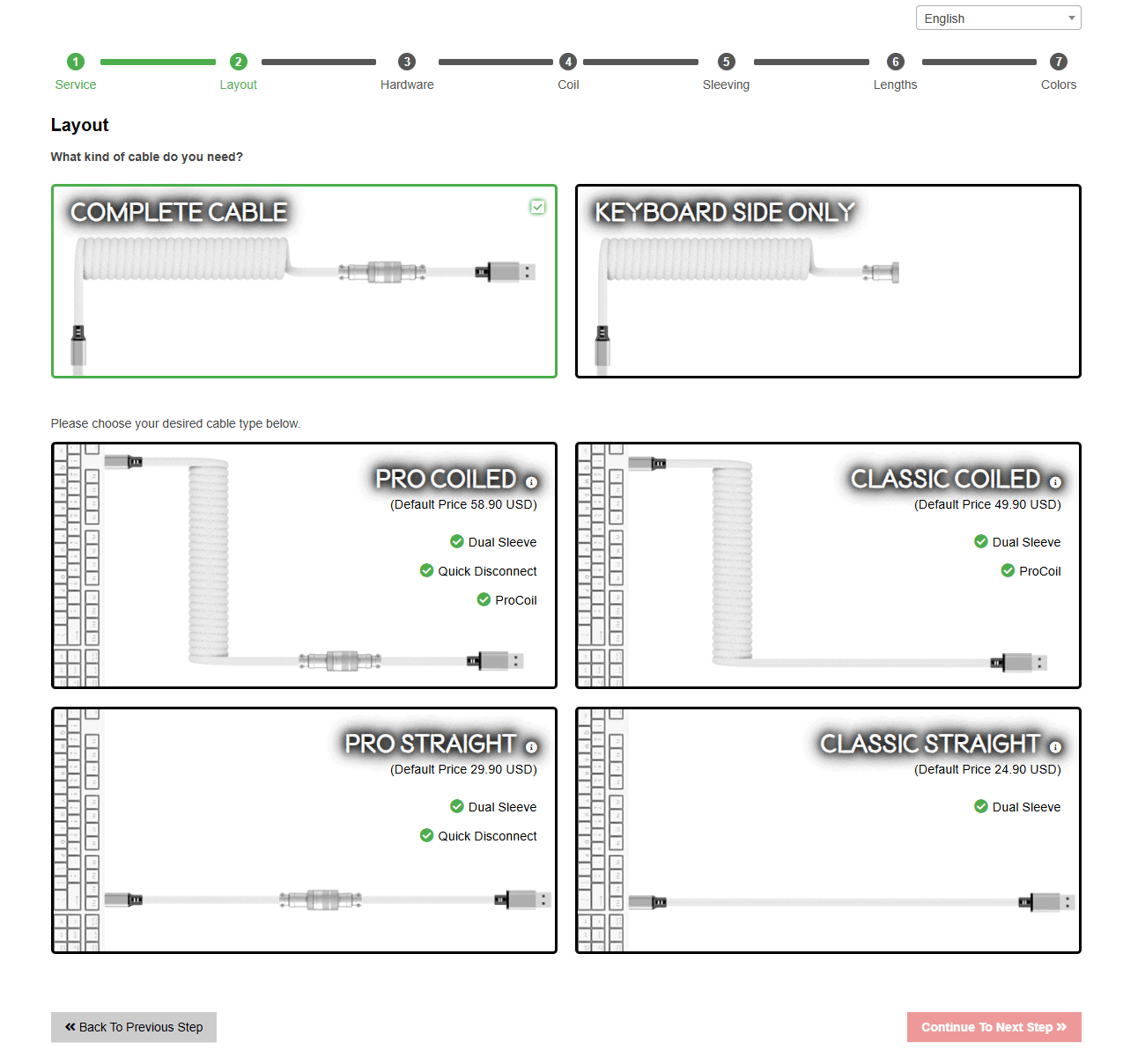 Laten we beginnen met de custom-keyboard-kabel. Deze is samengesteld in de configurator op de site van CableMod. Als je de configurator start, kies je eerst of je een volledige kabel wil of alleen de keyboardkant. Als je al een custom kabel van CableMod hebt en je wilt een nieuw keyboardgedeelte, dan hoef je niet het achterste deel opnieuw te bestellen; je kabel eindigt dan in een quick-connector.