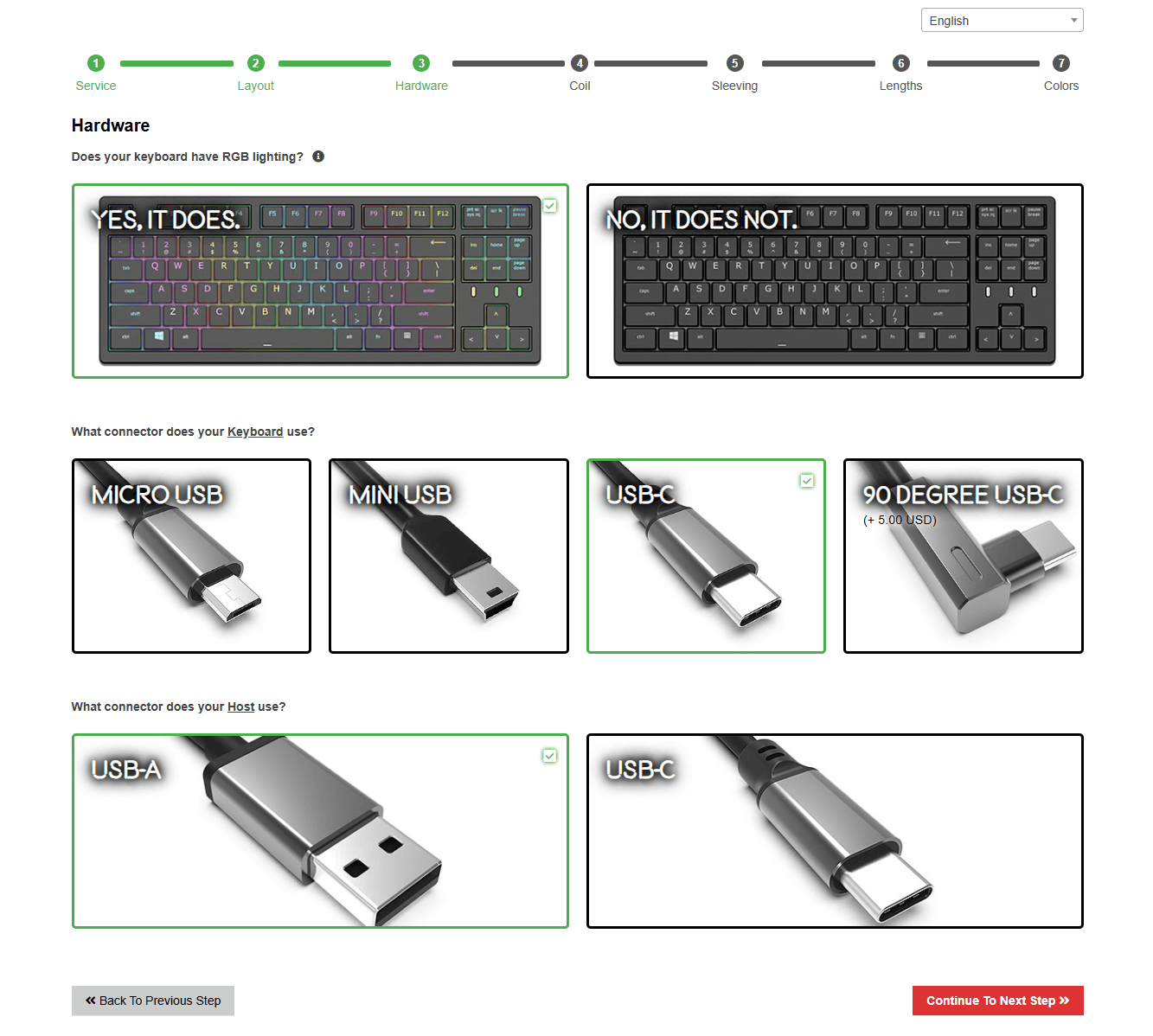De volgende optie is het soort kabel: classic coiled, pro coiled, classic straight of pro straight. De pro-toevoeging staat voor de aanwezigheid van een quick-connector in de kabel voor het snel losmaken en meenemen van je kabel. Ik heb gekozen voor de pro-coiled variant. Op de volgende pagina kies je of je keyboard RGB heeft en welke connectors je op de kabel wil. Aan de keyboardkant kun je kiezen tussen micro-USB, mini-USB, USB-C en USB-C met een hoek van 90 graden in de connector. Voor de hostkant kun je kiezen tussen USB-A en USB-C.