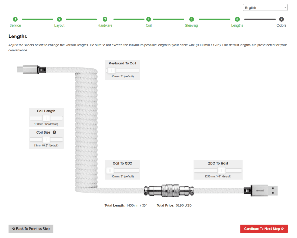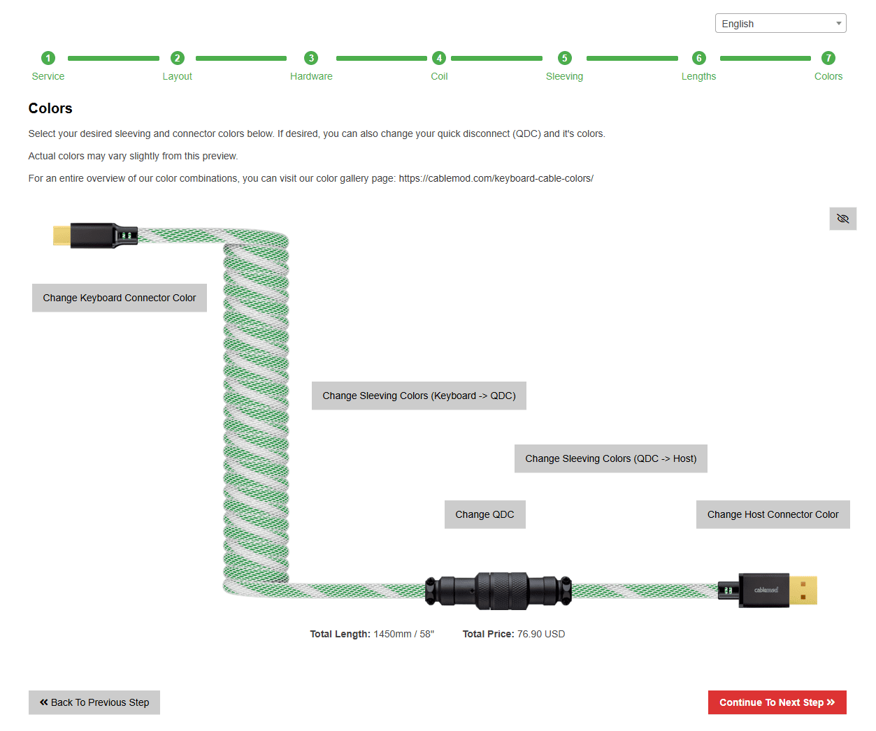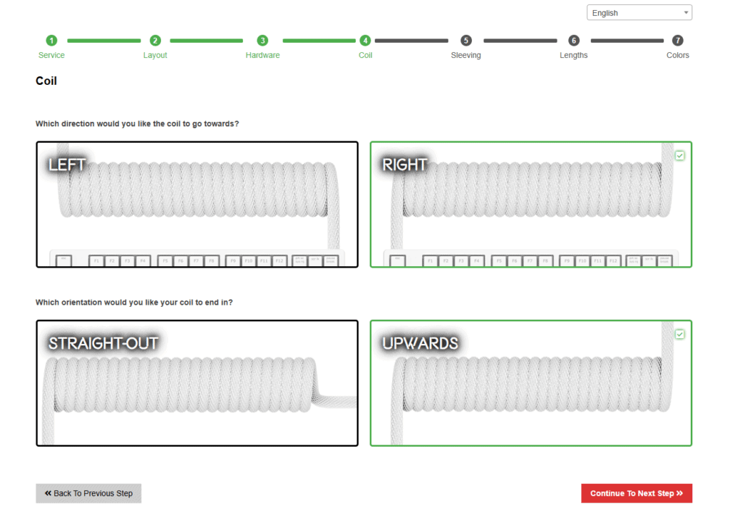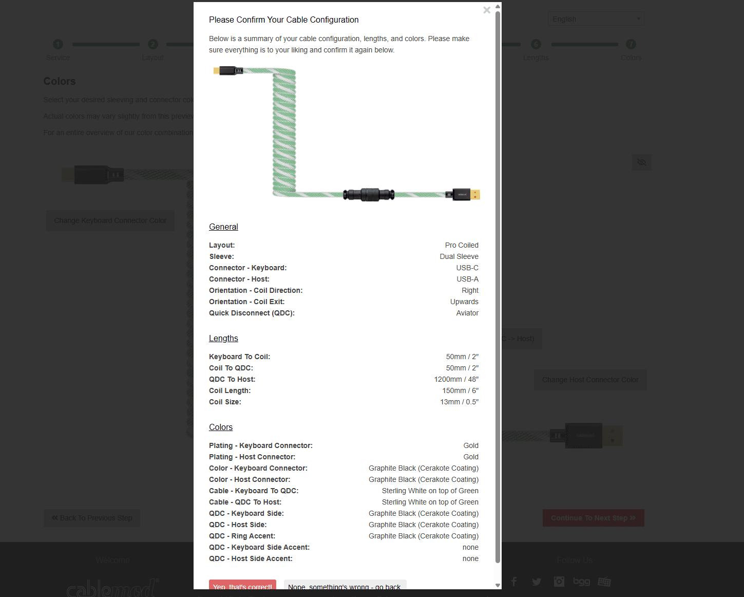 Vervolgens kom je in een scherm waar je alle maten van je kabel heel precies kan invoeren om de perfecte kabel voor jouw set-up samen te stellen. Je kunt elk deel van je kabel op de goede lengte instellen en zelfs kiezen hoe dik en lang je coil moet zijn. In het laatste scherm kun je dan per kabeldeel de kleuren kiezen en ook de kleuren voor je connectors kiezen. Ook voor de connectors heb je natuurlijk een zee aan opties. Als eerste kun je kiezen of je een connector wil met nikkelplating of met gold plating. Dan kun je kiezen wat voor afwerking je connector zelf krijgt. De opties zijn poedercoat, geanodiseerd, een Cerakote-coating of een heatshrink-sleeve. Voor al deze opties is natuurlijk ook weer een heel scala aan kleuren beschikbaar.