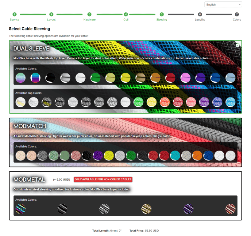 Hierna kies je de coil-richting en de manier waarop de kabel uit de coil komt. Hier kun je kiezen tussen naar boven of opzij. Dan is het tijd om de sleevesoort van de kabel te kiezen. Er zijn drie hoofdsoorten om uit te kiezen: Dual Sleeve, Modmatch en Modmetal. Voor de dual sleeve heb je de keuze uit maar liefst vijftien kleuren voor de binnensleeve en zeventien kleuren voor de buitensleeve. De Modmatch-kabels zijn dichter gevlochten in een tiger-weave en verkrijgbaar in maar liefst 20 kleuren. De Modmetal-kabels zijn verkrijgbaar in zes kleuren. Let wel op dat als je Modmetal wil, je een rechte kabel moet kiezen, want deze is niet verkrijgbaar als coil.