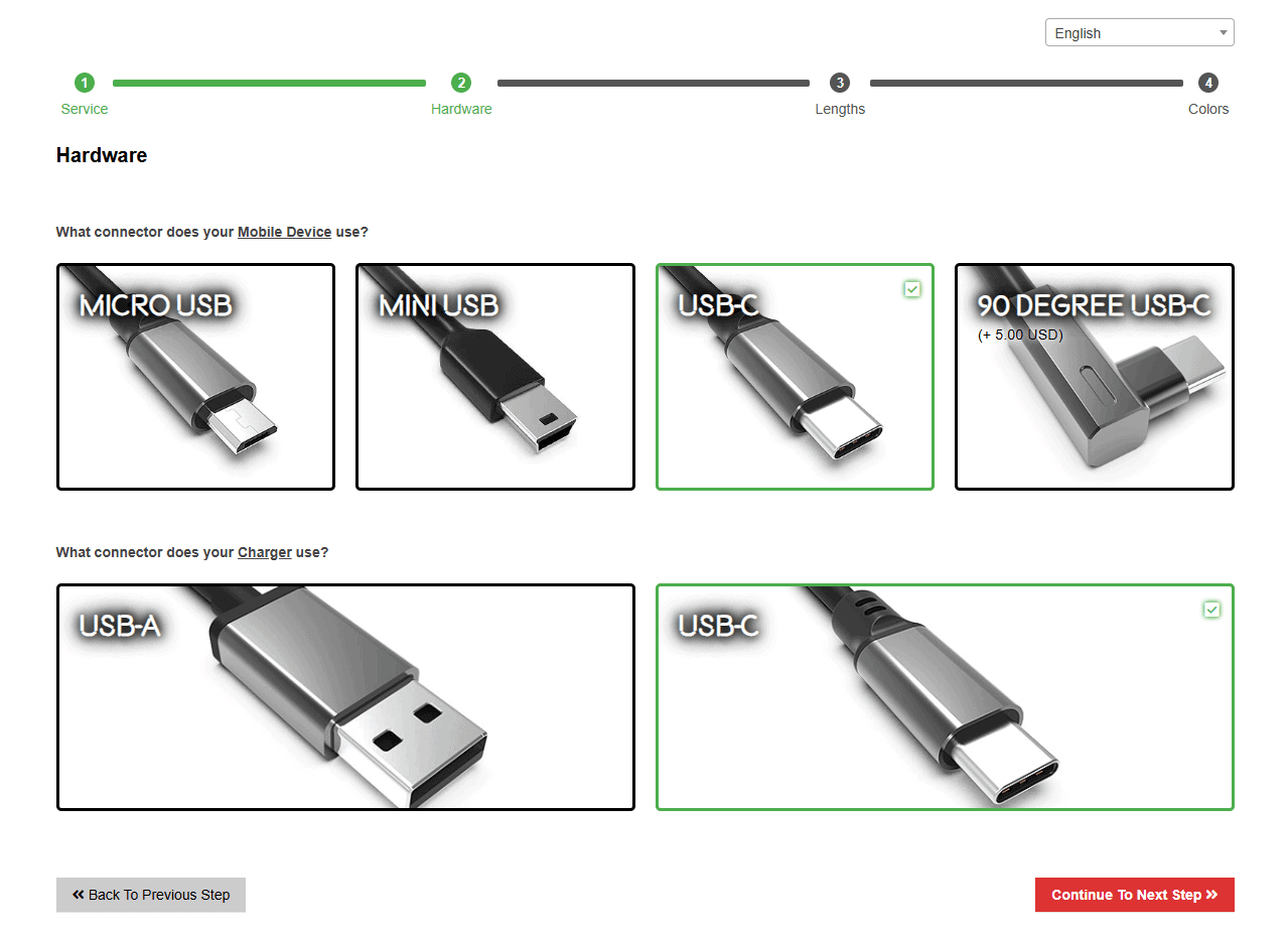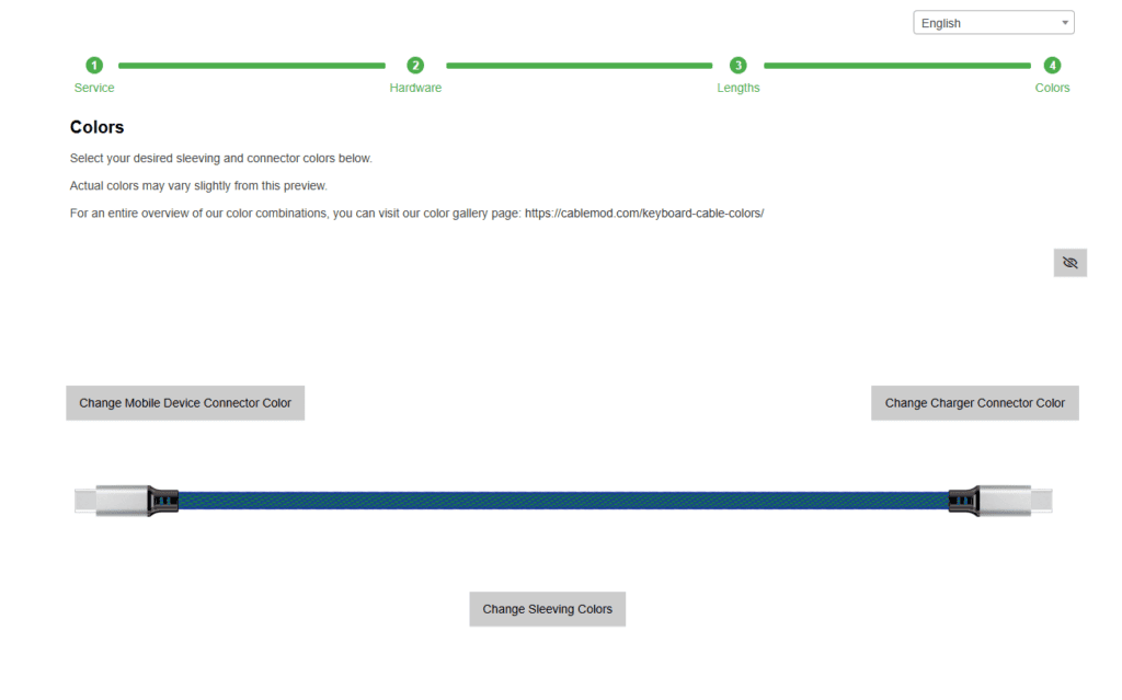 Naast de custom keyboardkabel hebben we ook een custom USB-C-chargingkabel mogen ontvangen van CableMod. Ook voor deze kabels is een configurator op de site aanwezig. In het eerste scherm kies je welke connectors de kabel moet hebben. Aan de device-kant kun je kiezen uit: Micro-USB, Mini-USB, USB-C en USB-C met een 90 graden hoek.