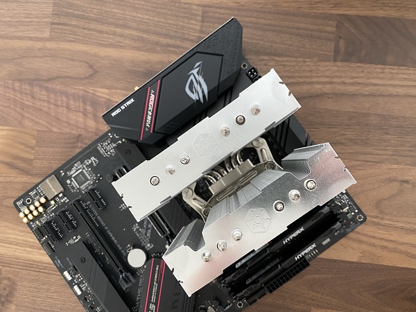 Nu is het enkel nog een dotje koelpasta, waarna je de CPU-koeler op zijn plaats vastschroeft. Bij de eerste keer monteren moest ik de montageplaten nog een klein beetje schuiven ter uitlijning met de voorgeïnstalleerde schroeven op de CPU-koeler. Ik zou dit vooraf aan het aanbrengen van koelpasta eerst controleren. Op de onderstaande foto is het asymmetrische ontwerp, ofwel het offset-ontwerp goed zichtbaar. Er is ruimte voor een tweede fan zonder dat deze belemmering oplevert voor het werkgeheugen.
