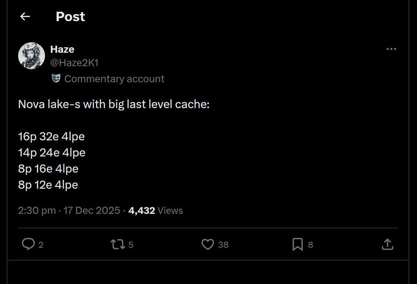Een theoretisch sub-vlaggenschipmodel zou een 2x 8+12 (40 cores + 4 LPE-cores) configuratie hebben, maar een andere expert is met een iets aangepaste specificatie gekomen. Gisteren bevestigde Haze (ook bekend als Haze2K1) grotendeels de eerder gelekte informatie, maar noemde een lager aantal prestatiekernen bij de beschrijving van de op één na beste ontgrendelde “Nova Lake-S"-chip - waardoor het totaal op 42 kwam (bestaande uit P-, E- en LPE-eenheden). In de herziene versie bevat elke tegel blijkbaar zeven prestatiegerichte eenheden in plaats van acht. Blijkbaar zal alleen het absolute topmodel beschikken over twee 8+16 compute-tegels - wat een totaal aantal kernen van 52 oplevert.