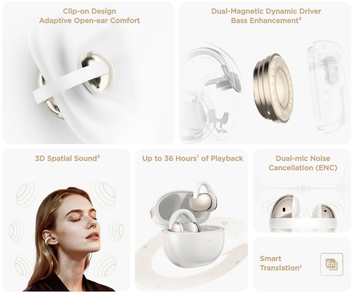 Het open-ear clip-on ontwerp is ontworpen om naadloos mee te bewegen met de ritmes van het dagelijks leven. Gebruikers kunnen belangrijke signalen opmerken, zoals naderend verkeer, openbare aankondigingen of gesprekken in de buurt, waardoor ze verbonden blijven met de wereld en vol vertrouwen kunnen luisteren naar muziek.