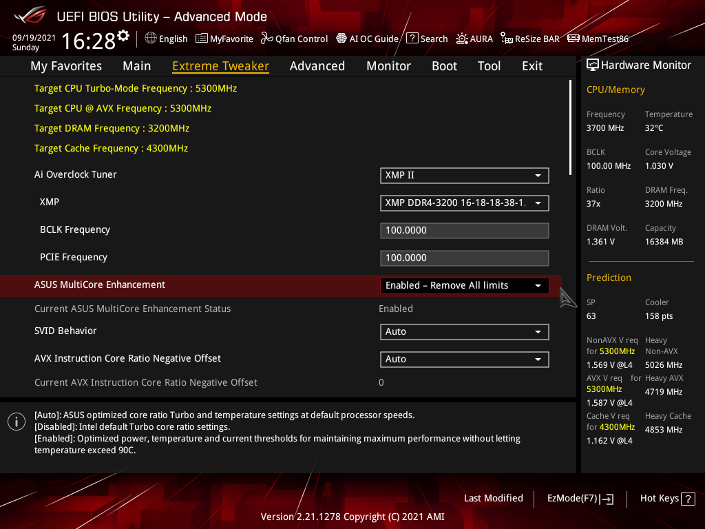 In hetzelfde spectrum als XMP/DOCP is het mogelijk om je processor automatisch te laten overklokken. Bij ASUS gaat die feature veelal door het leven als MultiCore Enhancement (MCE), al kan het ook zichtbaar zijn, al dan wel met een andere werking, als AI Overclocking, Core Performance Boost, CPU Power Enhancement, et cetera. Het doel van MCE is in ieder geval om alle kernen van de processor naar de hoogste frequentie te brengen in plaats van slechts één of twee.