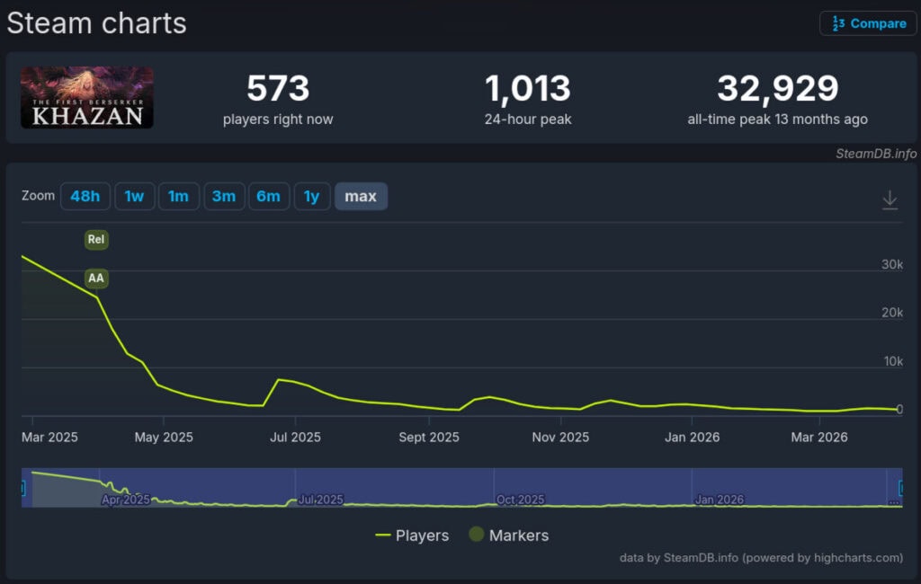 Volgens SteamDB bereikte The First Berserker: Khazan een piek van 32.929 gelijktijdige spelers op Steam rond de lancering, maar dat aantal daalde snel naar ongeveer 2.000 dagelijkse gelijktijdige spelers en zakte recent zelfs naar slechts 1.013. Ondanks het lage aantal spelers heeft The First Berserker: Khazan nog steeds een “Zeer positieve" beoordeling van 90% op Steam, en het spel scoorde over het algemeen goed bij critici, met een Metacritic-score van 78 en een gebruikersscore van 7,9 op dezelfde site.